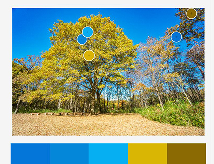 画像を投げ込むと自動的に5色が選択されます。5つの円で表示された色が右側の5色組のカラーテーマと一致しています。円を動かせば色を採取する位置を変更することができます。